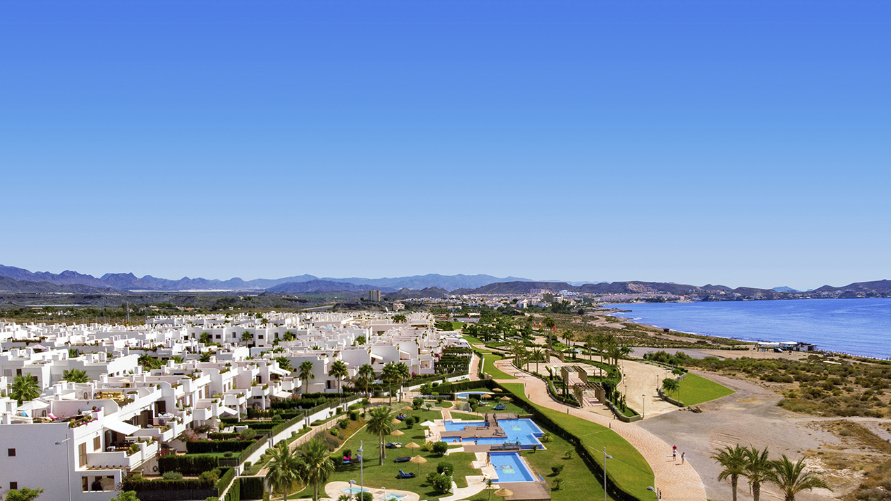 Situado en primera línea de mar en San Juan de los Terreros, vivir en Mar de Pulpí es despertarte a un paso de la playa La Entrevista y los Nardos. Cuenta con piscinas exteriores y climatizadas, lagos y jardines interiores