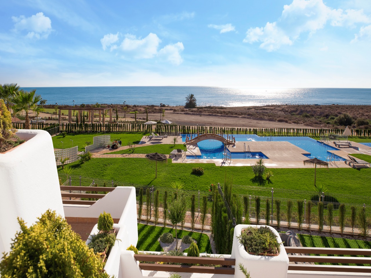 Situado en primera línea de mar en San Juan de los Terreros, vivir en Mar de Pulpí es despertarte a un paso de la playa La Entrevista y los Nardos. Cuenta con piscinas exteriores y climatizadas, lagos y jardines interiores